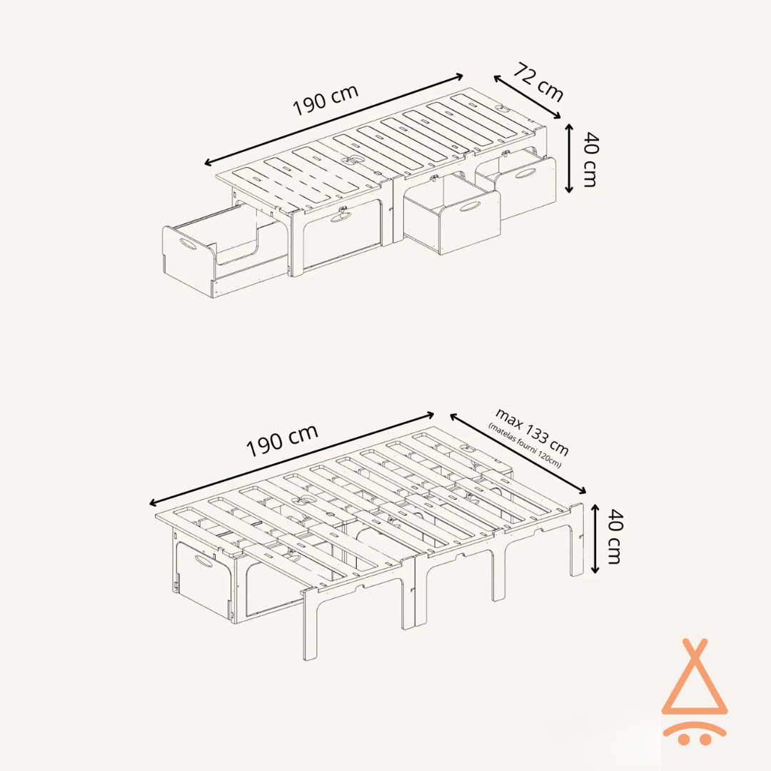 - Lit déplié : 190 cm (L) x 133 cm (l) x 40cm (h)